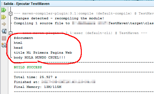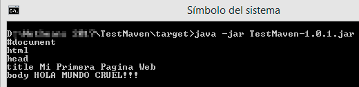 Importante en este caso la librería JSoup debería estar en el PATH o en la misma carpeta que nuestro archivo TestMaven-1.0.1.jar, caso contrario nos dará error (java.lang.NoClassDefFoundError: org/jsoup/Jsoup).