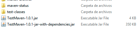 Si hacemos Clic derecho sobre el proyecto -> Build y abrimos la carpeta target, veremos que se genero un archivo jar ejecutable «TestMaven-1.0.1.jar«, pero este jar no contiene el archivo manifest donde se indica la clase principal Main y las dependencias de este, si tratamos de ejecutarlo tendremos problemas. A continuación dos formas de generar ejecutables con proyectos con Maven.