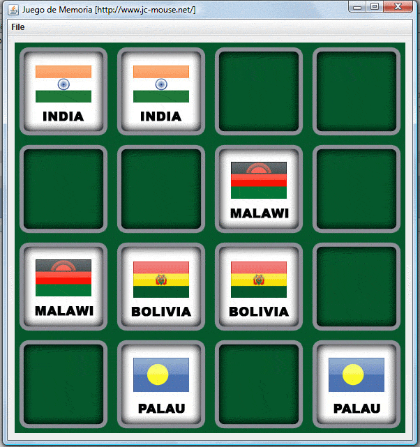 01 package com.bolivia.ram; 02 import java.awt.Component; 03 import java.awt.Dimension; 04 import java.awt.event.MouseEvent; 05 import java.awt.event.MouseListener; 06 import javax.swing.BorderFactory; 07 import javax.swing.JOptionPane; 08 import javax.swing.JPanel; 09 import javax.swing.SwingWorker; 10 /** 11 * @web https://www.jc-mouse.net/ 12 * @author Mouse 13 */ 14 public class Tablero extends JPanel{ 15 //array con los nombres de las banderas 8 en total para 16 pares 16 private String[] band = {"angola","bolivia","eritrea","haiti","india","malawi","palau","portugal"}; 17 18 private int fila =4; 19 private int col = 4; 20 private int ancho_casilla=140; 21 22 public boolean play = false; 23 24 int c=0; 25 Casilla c1; 26 Casilla c2; 27 int aciertos=0; 28 29 /** Constructor de clase */ 30 public Tablero(){ 31 super(); 32 //propiedades 33 setBorder( BorderFactory.createEmptyBorder(0, 0, 0, 0)); 34 setLayout( new java.awt.GridLayout(fila, col) ); 35 Dimension d= new Dimension( (ancho_casilla*col),(ancho_casilla*fila) ); 36 setSize(d); 37 setPreferredSize(d); 38 //crea instancias de casillas para crear el tablero 39 int count=0; 40 for(int i=1;i<=(fila*col);i++){ 41 Casilla p = new Casilla( String.valueOf(i) ); 42 p.setBandera( band[count] ); 43 count++; 44 count = (count>=band.length)? 0:count++; 45 p.showBandera(); 46 p.addMouseListener( new juegoMouseListener() ); 47 this.add( p ); 48 } 49 setVisible(true); 50 } 51 52 /** 53 * Inicia juegos 54 * - llena las casillas con pares de banderas 55 * @return no tiene 56 */ 57 public void comenzarJuego(){ 58 aciertos=0; 59 play=true; 60 Component[] componentes = this.getComponents(); 61 //limpia banderas 62 for( int i=0; i< componentes.length ;i++){ 63 ((Casilla)componentes[i]).congelarImagen(false); 64 ((Casilla)componentes[i]).ocultarBandera(); 65 ((Casilla)componentes[i]).setBandera( "" ); 66 } 67 //coloca nuevo orden aleatorio de banderas 68 for( int i=0; i< componentes.length ;i++){ 69 int n = (int) (Math.random()*(band.length)); 70 if( !existe(band[n]) ){//comprueba que bandera no este asignada mas de 2 veces 71 ((Casilla)componentes[i]).setBandera( band[n] ); 72 }else{ 73 i--; 74 } 75 } 76 77 } 78 79 80 /** 81 * Metodo que comprueba que una casilla existe 82 * @param int num nombre del objeto 83 * @return Casilla si existe 84 * NULL si no existe 85 */ 86 private boolean existe( String bandera ){ 87 int count=0; 88 Component[] componentes = this.getComponents(); 89 for( int i=0; i<componentes.length;i++ ) { 90 if( componentes[i] instanceof Casilla ) { 91 if( ((Casilla)componentes[i]).getNameBandera().equals( bandera ) ) { 92 count++; 93 } 94 } 95 } 96 return (count==2)? true:false; 97 } 98 99 /** 100 * Clase que implemenenta un MouseListener para la captura de eventos del mouse 101 */ 102 class juegoMouseListener implements MouseListener{ 103 104 @Override 105 public void mouseClicked(MouseEvent e) { 106 107 if( play ){ 108 c++;//lleva la cuenta de los click realizados en las casillas 109 if( c==1 ){ //primer click 110 c1=((Casilla) e.getSource()); //obtiene objeto 111 if( !c1.isCongelado() ){ 112 c1.showBandera(); 113 System.out.println("Primera Bandera: " + c1.getNameBandera() ); 114 }else{//no toma en cuenta 115 c=0; 116 } 117 }else if( c==2 && !c1.getName().equals( ((Casilla) e.getSource()).getName() ) ){//segundo click 118 c2=((Casilla) e.getSource()); 119 if( !c2.isCongelado() ){ 120 c2.showBandera(); 121 System.out.println("Segunda Bandera: " + c2.getNameBandera() ); 122 //compara imagenes 123 Animacion ani = new Animacion( c1, c2 ); 124 ani.execute(); 125 } 126 c=0;//contador de click a 0 127 }else{ //mas de 2 clic consecutivos no toma en cuenta 128 c=0; 129 } 130 }else{ 131 System.out.println("Para jugar: FILE -> JUGAR"); 132 } 133 134 135 } 136 137 @Override 138 public void mousePressed(MouseEvent e) {} 139 140 @Override 141 public void mouseReleased(MouseEvent e){} 142 143 @Override 144 public void mouseEntered(MouseEvent e) {} 145 146 @Override 147 public void mouseExited(MouseEvent e) {} 148 149 } 150 151 /** 152 * 153 */ 154 class Animacion extends SwingWorker<Void, Void>{ 155 private Casilla casilla1; 156 private Casilla casilla2; 157 158 public Animacion(Casilla value1, Casilla value2){ 159 this.casilla1= value1; 160 this.casilla2= value2; 161 } 162 163 @Override 164 protected Void doInBackground() throws Exception { 165 System.out.println("doInBackground: procesando imagenes..."); 166 //espera 1 segundo 167 Thread.sleep( 1000 ); 168 if( casilla1.getNameBandera().equals( casilla2.getNameBandera() ) ){//son iguales 169 casilla1.congelarImagen(true); 170 casilla2.congelarImagen(true); 171 System.out.println("doInBackground: imagenes son iguales"); 172 aciertos++; 173 if( aciertos == 8 ){//win 174 System.out.println("doInBackground: Usted es un ganador!"); 175 JOptionPane.showMessageDialog(null,"Usted es un ganador!"); 176 } 177 } 178 else{//no son iguales 179 casilla1.ocultarBandera(); 180 casilla2.ocultarBandera(); 181 System.out.println("doInBackground: imagenes no son iguales"); 182 } 183 return null; 184 } 185 186 } 187 188 }