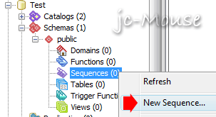 – Conéctate a Postgres y abre el pgAdminIII, selecciona la base de datos con la que trabajaras y busca el campo «Sequences», dale click derecho y elegi la opción «New Sequence…».