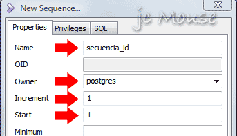 – En la ventana que aparece «New Sequence…», debes rellenar el campo Name: nombre para la secuencia, Owner: el propietario que hara uso de la secuencia, en mi caso se llama «postgres«, Increment: el incremento, si lo dejas vacio, incrementara de 1 en 1, pero es mejor especificarlo, Start: en que valor iniciara el incremento, tenemos otros valores para completar, pero por el momento lo que tenemos es suficiente. Para terminar dale OK