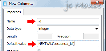 – Para agregar esta secuencia en un campo de cualquier tabla, debemos darle un nombre a la columna, en este caso sera tambien «id», el tipo de dato Data Type sera Integer y en campo Default Value, debemos agregar la secuencia que creamos en el paso anterior, de la siguiente manera: NEXTVAL(‘secuencia_id’), es decir: