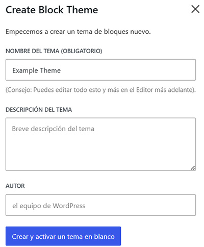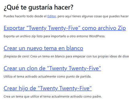 De las opciones disponibles, elegimos «Crear un nuevo tema en blanco». El resto de las opciones nos permiten trabajar/crear temas a partir del tema activo, en este caso «Twenty Twenty-five».