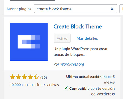 En WP nos vamos al menu Plugins -> Añadir plugin -> Los buscamos con «Create Block Theme» -> Y finalmente lo instalamos.