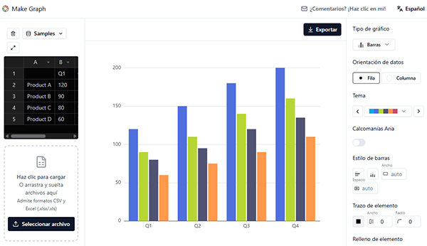 Usualmente las herramientas gratuitas ofrecen pocas alternativas en tipos de gráficos o limitan sus opciones. MakeGraph.app va mucho más allá. Me sorprendió encontrar tipologías como el Radar, esencial para comparar métricas multivariadas de forma intuitiva, y el Boxplot (Diagrama de Caja), vital para el análisis estadístico rápido, permitiendo identificar la mediana y los outliers de un vistazo. La interfaz es intuitiva; puedes alternar entre un gráfico de Barras y un gráfico de Líneas con un solo clic en la configuración, demostrando que los datos están cargados en un modelo de objeto bien estructurado que permite el re-renderizado dinámico sin recargar la página.