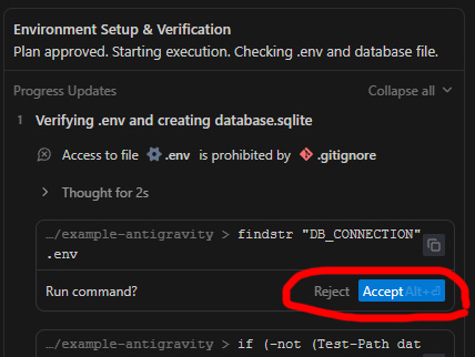 La web oficial del IDE es https://antigravity.google , lo descargamos e instalamos con las opciones por defecto, como se mencionó más arriba, Antigravity puede hacer uso de la terminal, el navegador, el sistema de archivos, etc, pero por seguridad este te pedira permiso, esto claro se puede modificar para automatizarlo aún más, pero por el momento lo dejamos como viene.