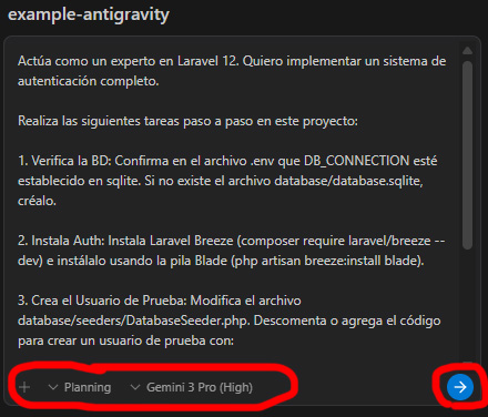 Pegamos nuestro prompt, a continuación seleccionamos la opcion Plannig, más abajo explicaremos el porque, luego seleccionamos el agente IA, en este ejemplo usamos «Gemini 3 Pro (High)». Finalmente presionamos el boton azul con una flecha blanca y esperamos unos segundos.
