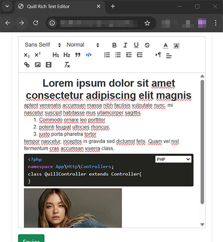 En este post se implementara un ejemplo de su integración limpia en vistas Blade de Laravel, la personalización de la barra de herramientas y la gestión de contenido estructurado, veremos así por qué Quill es la opción ideal si busca un editor que le devuelva el control.