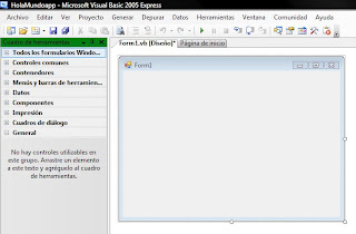 2. En la ventana principal de VB.NET se crea un nuevo formulario donde podra añadir objetos, al lado izquierdo se muestra el «cuadro de herramientas», si este no esta visible, solo debe hacercar el cursor hacia la izquierda y este se desplegara automaticamente.