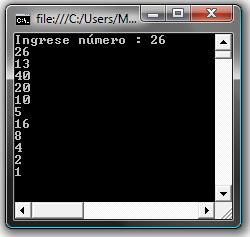 Module problema_320 Sub Main() Console.Write("Ingrese número : ") Dim N = Val(Console.ReadLine) If N > 0 Then Console.WriteLine(N) While N <> 1 If (N Mod 2) = 0 Then N = N \ 2 Else N = N * 3 + 1 End If Console.WriteLine(N) End While Else Console.Write("N tiene que ser un entero positivo") End If Console.ReadLine() End Sub End Module